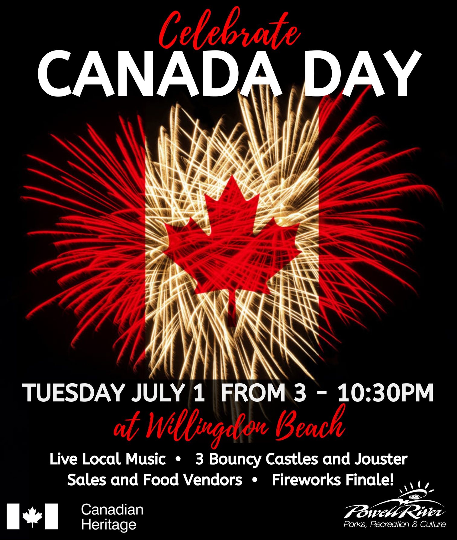 Each year, the City of Powell River hosts its Community Canada Day Celebrations at Willingdon Beach Park. Come down for an afternoon and evening of fun and mingle with your family and friends while enjoying various musical and theatrical celebrations on stage at the Rotary pavilion with a fireworks finale! There are lots of games and activities available for all ages!