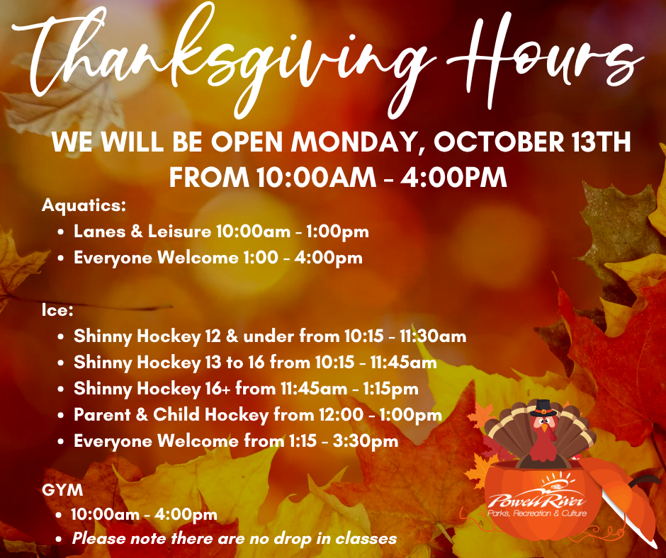 - Please note special skating schedules on Thanksgiving Monday October 13 and Remembrance Day Tuesday November 11