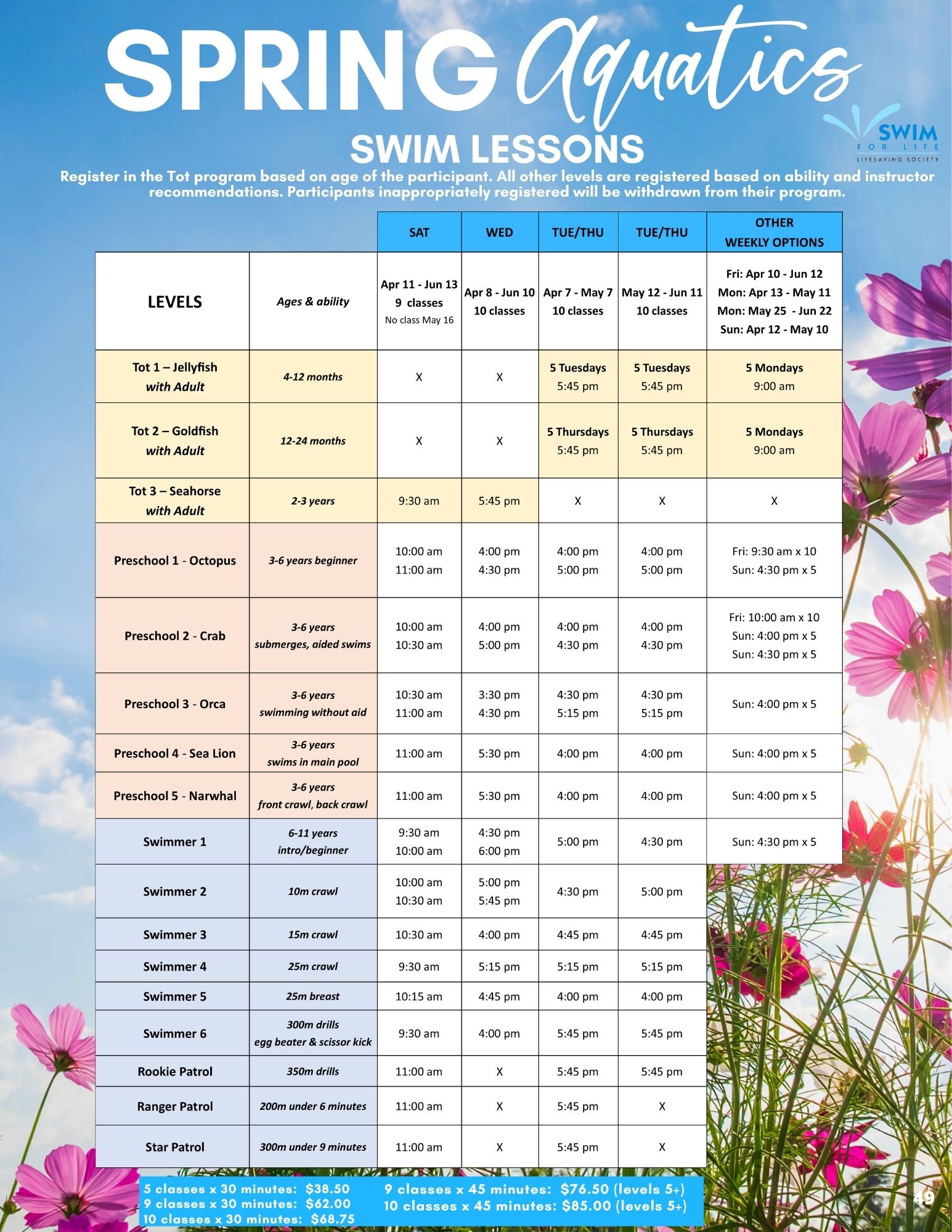 We are pleased to offer the Swim for Life program for those aged 4 months to 12 years old. Tots under the age of 3 years will participate with their parent or caregiver in classes based on their age. Preschoolers aged 3-6 years will join a small class with an instructor where kids may progress through five levels based on skills and ability. Once kids are 6 years old, they may progress through six Swimmer levels that lead into the Swim Patrol program, where youth begin to learn lifesaving skills and swim workouts become demanding. Please follow our recommendations for lesson registration to help build kids’ comfort and confidence in the water. Refer to the link below for an overview on levels and more information.